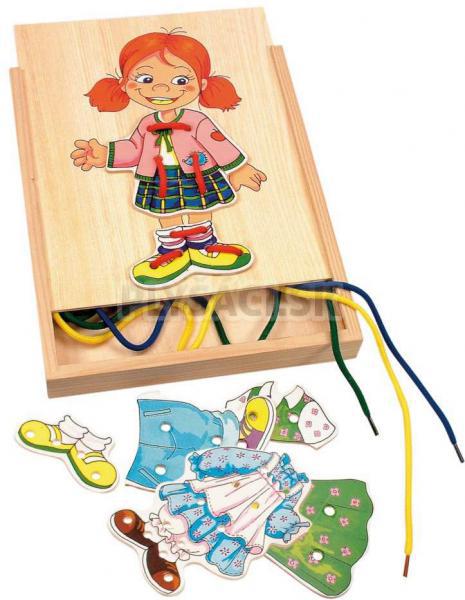 Na šnurovacom šatníku môžu deti obliekať a meniť postavičku dievčatka podľa ich fantázie. Nenáročne rozvíjajú schopnosť logického myslenia a fantázie.